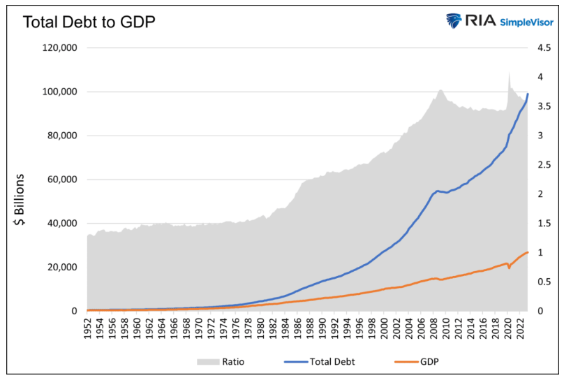 美国债务水平及其与GDP的比率明显高于四十年前美联储主席保罗·沃尔克以两位数利率抑制通胀时的水平。债务总额是2008年的两倍,那场危机几乎让整个银行体??系破产。