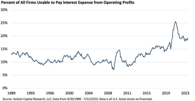 考虑到大约五分之一的上市公司是僵尸企业,如下图所示,由Kailash Capital Research提供。正如他们所描述的,僵尸公司的债务支付超过了其利润。并不是所有的僵尸都会随着利率的升高而消亡。有些人的收入和利润增长速度足以满足其债务支出。其他人可能手头有现金来满足债权人的要求。然而,五分之一的美国公司中的大多数只能通过发行更多债务来维持生存。因此,即将到来的危机可能是僵尸末日吗?