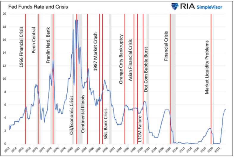 Lebowitz表示,如下所示,每当联邦基金突然上涨时,就会发生危机。仔细观察,你会发现大多数情况都是在加息之后发生的,并很快被美联储通过大幅降低联邦基金利率来解决。在联邦基金利率高达5.50%,以及所有债券收益率类似增长之后,金融危机实际上是不可避免的,这是有“金融历史”可以借鉴的。