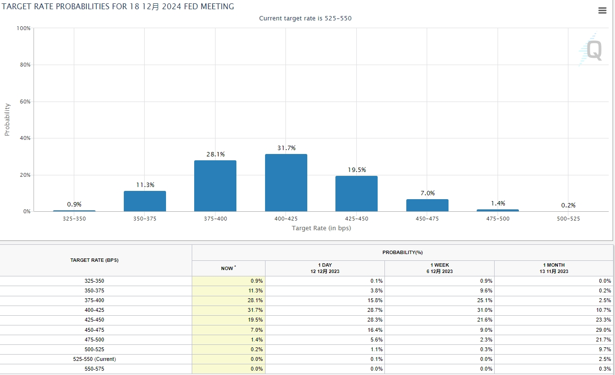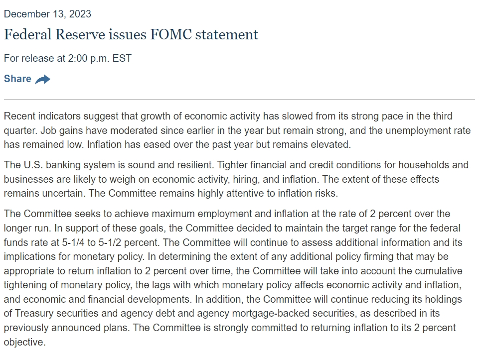 另据央视新闻,当地时间12月13日,根据美联储最新的联邦公开市场委员会(FOMC)货币政策会议纪要显示,美联储决定12月仍放缓加息步伐,将联邦基金利率目标区间继续维持在5.25%至5.50%之间。