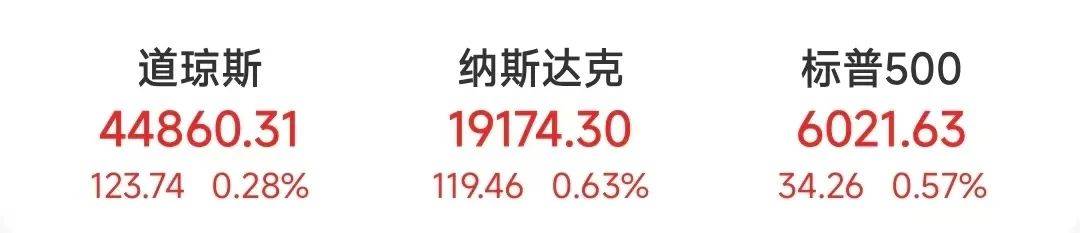 当地时间11月26日,美股三大指数收高,道指涨123.74点,涨幅为0.28%,报44860.31点;纳指涨119.46点,涨幅为0.63%,报19174.30点;标普500指数涨34.26点,涨幅为0.57%,报6021.63点。