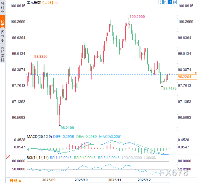 周三(12月31日)亚市早盘时段,现货黄金窄幅震荡,目前交投于每盎司4335美元附近,仍处于年度较高位;美原油窄幅震荡,交投于每桶57.95美元附近;美元指数于98.25附近窄幅震荡,24日一度触及97.75的近三个月低点。