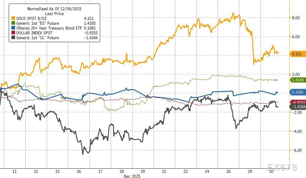 自12月10日美联储会议(最终结果较预期更偏鸽派:降息25个基点,但出现3票反对)以来,贵金属因美元走弱成为最大赢家,而原油表现相对滞后。股市小幅上扬,债券几无波动。