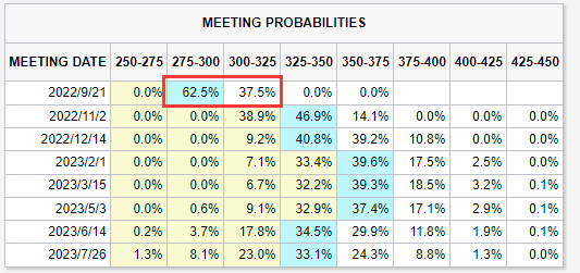 芝商所的美联储观察工具显示,该行9月加息50个基点的概率重回主流,达到六成以上;而加息75个基点的概率降至37%左右,较昨日减少了30个百分点。