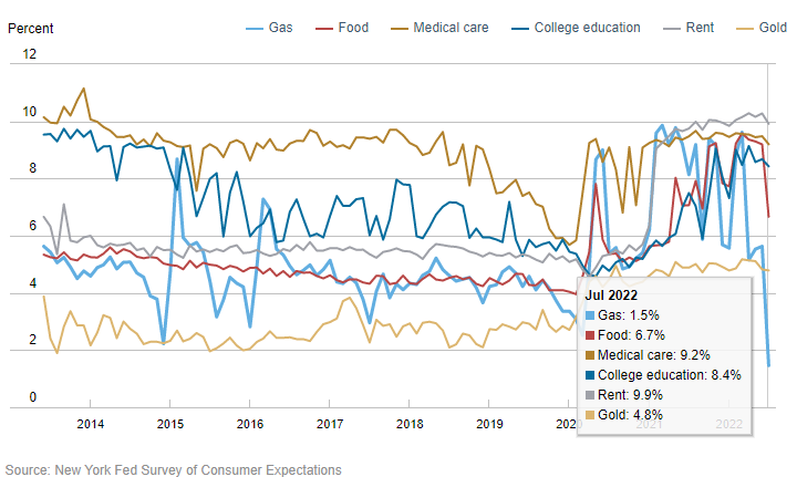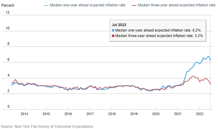 具体数据显示,7月份美国消费者对未来一年通货膨胀率的预期中值为6.2%,未来三年的为3.2%,而6月份时这两项数据为6.8%和3.6%,分别下跌了0.6和0.4个百分点。未来五年的通胀预期中值也略微下滑,下降0.5个百分点至2.3%。