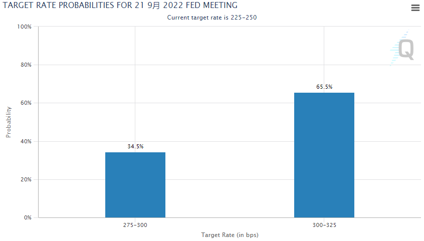芝商所美联储观察工具显示,该行在9月加息75个基点的概率接近三分之二,加息50个基点的概率为三分之一。