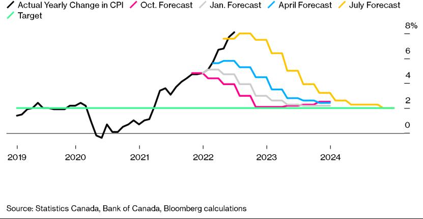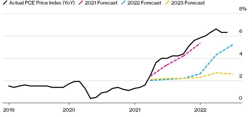 同样,彭博社在2021年底对经济学家的调查显示,中值估计是美国的整体消费者价格通胀(当时为7%)将在2022年全年保持在4.3%左右。然而,仅仅六个月的时间,价格涨幅就已经超过了这一水平,分析师们也上调了预期。