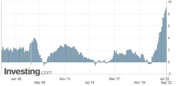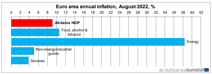 欧盟统计局周三(8月31日)公布的初步统计报告显示,欧元区8月份消费者物价指数同比上升9.1%,为欧元区成立20多年来最高的通胀率。同时该数值还高于市场预期的9%,较7月的8.9%增加了0.2个百分点。