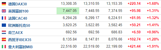 股市方面,德国DAX指数涨1.68%,意大利富时MIB指数均涨1.9%,欧洲斯托克50指数涨1.4%,英国富时100指数涨1.3%;美股三大期指也小幅走高。