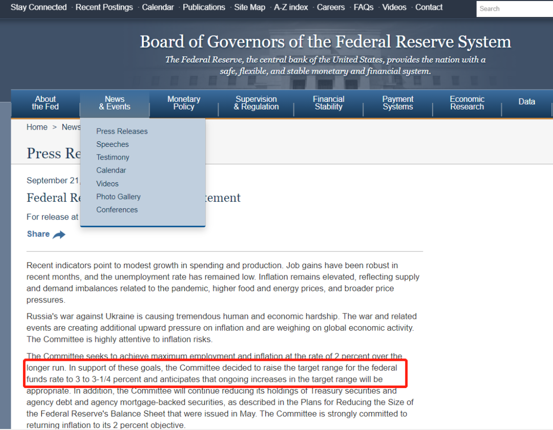 当地时间9月21日下午,美联储发布的联邦公开市场委员会(FOMC)声明指出,委员会寻求实现最大化就业和通胀长期处于2%。为了支撑这些目标,委员会决定将联邦基金利率提升至3%-3.25%区间(此前为2.25%-2.5%),预计未来进一步提升是合适的。
