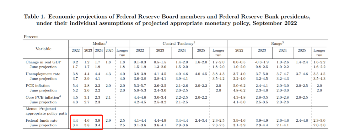 美联储网站公布的经济预期概要(SEP)显示,今年年底的联邦基金利率中值将达到4.4%,远高于6月份时的3.4%;未来两年的利率中值则达到4.6%、3.9%,6月份时则分别为3.8%、3.4%。