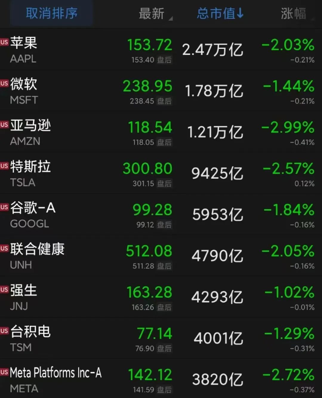 盘面上看,大型科技股多数下跌。亚马逊跌2.99%,脸书母公司Meta、特斯拉、苹果跌逾2%,微软、谷歌、台积电跌超1%,英伟达逆势涨0.65%。