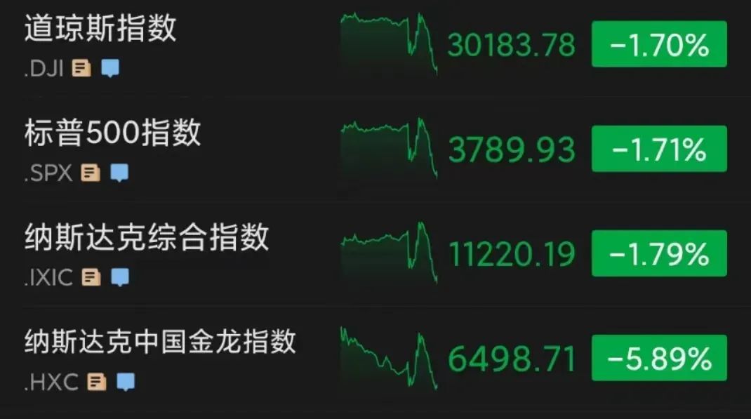 截至收盘,道指跌522.45点,收于30183.78点,跌幅为1.70%;标普500指数跌1.71%至3789.93点,下破3800点大关;纳斯达克指数跌1.79%,收报11220.19点。纳指和标普指数盘中一度涨超1%。