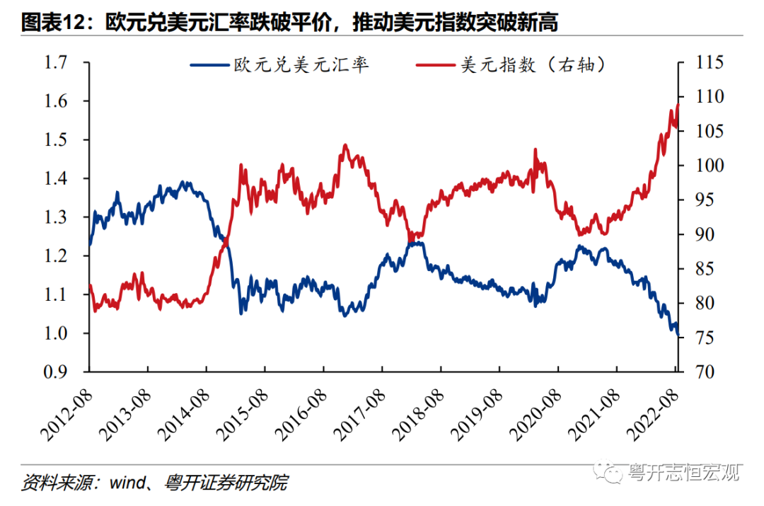美欧经济周期与货币周期差或将推动美元指数继续冲高。今年美国与欧洲的经济增长差距扩大,或将推动美元指数创新高,新兴市场货币贬值压力较大。一是美联储鹰派紧缩,欧央行加息落后于美元,欧元区内部债务风险分化进一步拖累欧央行加息。二是秋冬季欧元区经济衰退风险加大,欧元基本面受到能源危机、债务风险、政局不稳三大因素困扰,地缘冲突下欧洲能源缺口导致生产瓶颈,推高通胀预期,扩大贸易逆差。