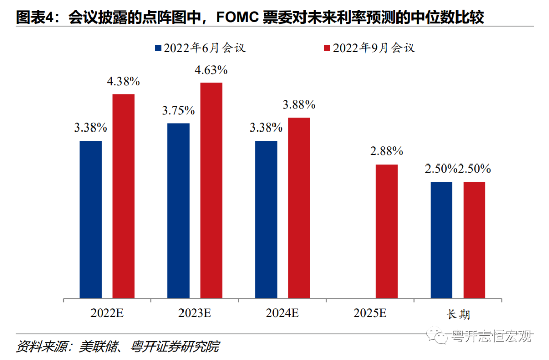 今年年内还有100-125bp的加息幅度。8位票委预测今年利率达到4.125%,9位票委预测今年利率达到4.375%。这意味接下来的两次会议(11月和12月)还有100-125bp的加息幅度。半数票委认为11月加息75bp、12月加息50bp,这也超出了市场预期。此前投资者低估了美联储短期内加息的立场和抗击通胀的决心。