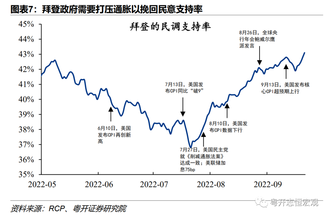 二是中期选举临近抗通胀的政治诉求更加迫切。美国高通胀给经济和民生带来巨大压力,也是导致拜登政府支持率下滑的主要因素。7月下旬以来,拜登推动《2022通胀削减法案》,民意支持率回升。中期选举临近,拜登政府抗通胀的诉求更加迫切,美联储的鹰派立场也需要表现的更加坚定。