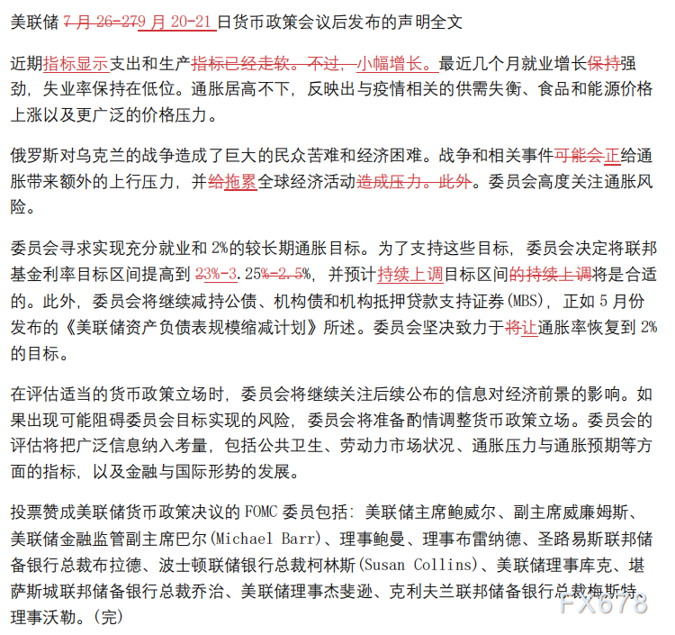 委员会寻求实现充分就业和2%的较长期通胀目标。为了支持这些目标,委员会决定将联邦基金利率目标区间提高到3%-3.25%,并预计持续上调目标区间将是合适的。此外,委员会将继续减持公债、机构债和机构抵押贷款支持证券(MBS),正如5月份发布的《美联储资产负债表规模缩减计划》所述。委员会坚决致力于让通胀率恢复到2%的目标。