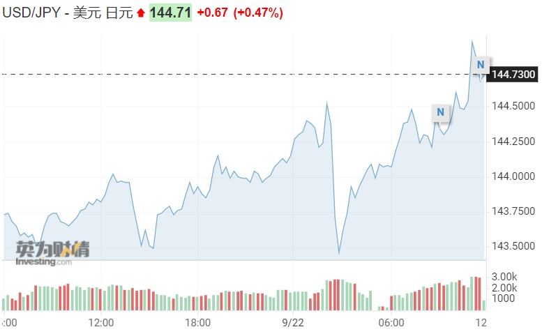 在美联储加息75基点、且日本央行宣布维持超宽松货币政策之后,美元兑日元一度升至145点上方,创下24年高点,目前报144.73点。