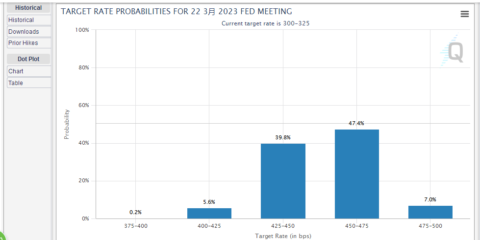 受此影响,市场也对潜在风险下美联储被迫可能放松政策力度进行了定价。芝商所(CME)利率观察工具(FedWatch)显示,激进加息有望在今年年底结束,明年3月美联储利率预期回落至4.44%,较议息会议后回落近20个基点,首次降息可能出现在9月,这也明显低于美联储最新预测。