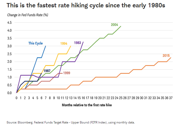 嘉信理财汇总发现,从今年3月开始的加息周期已经是自20世纪80年代初以来紧缩强度最高的一轮。此外,美联储正在实施量化紧缩计划,目前整个缩表速度已经达到950亿美元,远超过上一轮量缩的规模。纵观过去一周的观点,各位美联储官员结论基本是相同的:加息的脚步不会停下,而且利率峰值可能会持续很长一段时间。