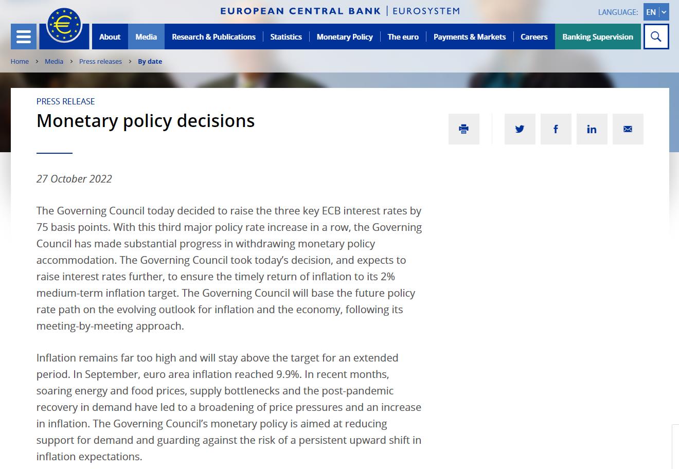 据欧洲央行网站消息,北京时间27日晚间,欧洲央行宣布加息75个基点,符合市场预期。