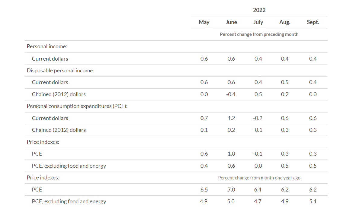 先看数据,作为美联储政策目标的核心PCE通胀在9月环比增长0.5%,符合预期,同比增长5.1%,稍稍低于预期值5.2%。把波动更剧烈的食品和能源价格加上,9月PCE数据环比和同比分别增长0.3%和6.2%,与8月的数据一模一样。同时,美国9月的个人收入和支出数据分别为0.4%和0.6%,也都好于预期。