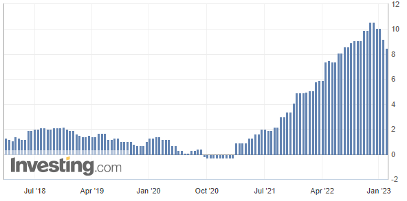本月月初,欧盟统计局公布的报告显示,欧元区1月通胀率——调和消费者物价指数(HICP)年率录得8.5%,低于去年12月的9.2%,连续三个月放缓。