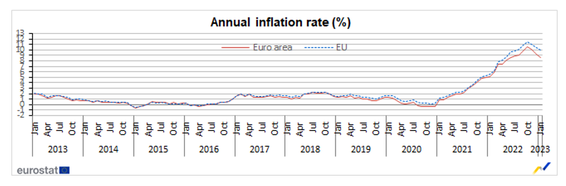 当地时间周四,欧盟统计局公布的数据显示,欧元区1月份CPI同比上涨8.6%,略高于此前预期的8.5%,虽然较去年12月的9.2%有所下降,但仍远高于去年同期的5.1%。