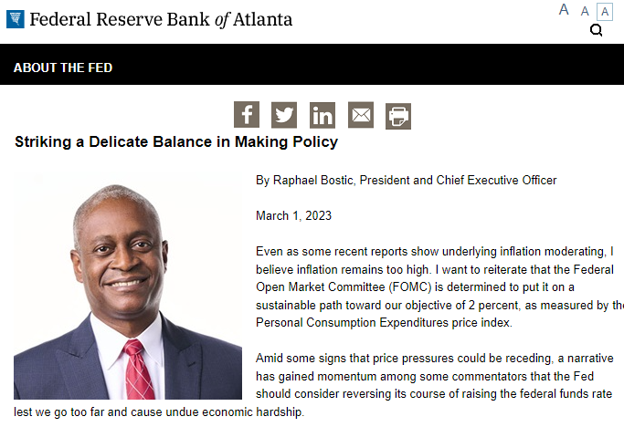 当地时间周三(3月1日),亚特兰大联储在官网公布了该行主席拉斐尔·博斯蒂克一篇最新的关于货币政策的文章。