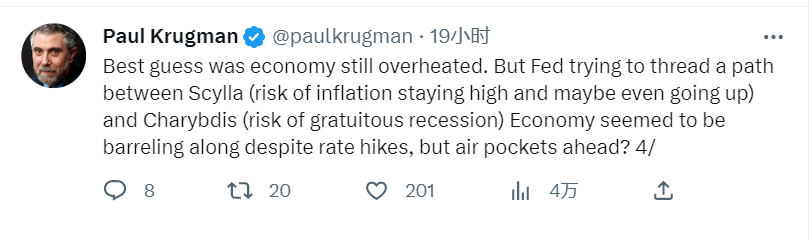 “最好的猜测是经济仍然过热。但美联储试图在Scylla(通胀保持高位甚至可能上升的风险)和Charybdis(无端衰退的风险)之间找到一条路径。尽管加息,但经济似乎仍在快速增长,但前方已是气穴(air pockets)?”克鲁格曼表示。