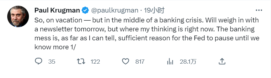 根据克鲁格曼的说法,当前银行业的“混乱”局面足以让美联储暂停加息行动,直到情况更加明朗。