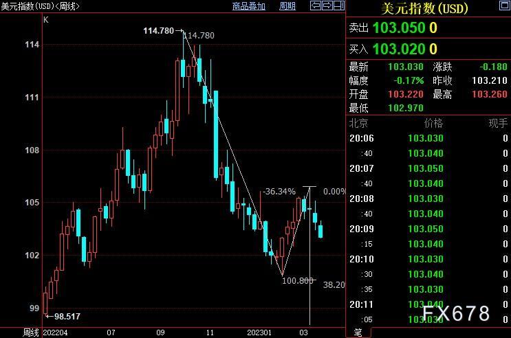 周线上看,美元指数自105.88开启下行(c)浪,下方支撑看向23.6%目标位102.58和38.2%目标位100.54。(c)浪是自114.78开启的下行((2))浪的子浪。