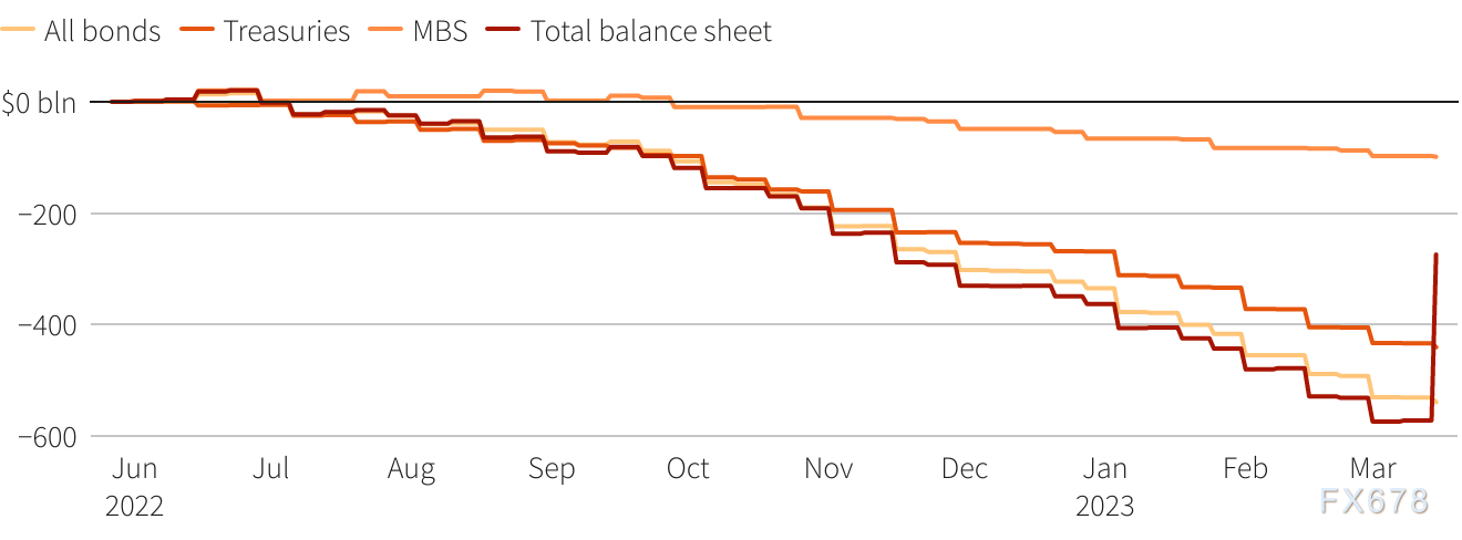 在此之前的短短九个月里,美联储一直在缩减其在大流行期间累计的高达近9万亿美元的超大规模资产负债表。这种被称为“量化紧缩”(QT)的政策与几十年来最激进的加息同步进行。