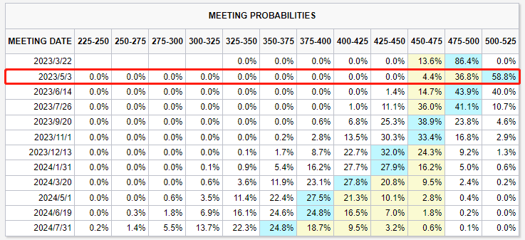市场预期也反映在专业机构的预测中。在彭博社调查的98位经济学家中,有11位预计美联储将在本周宣布暂停加息,而野村证券甚至预计美联储将降息25个基点。此外,在近期银行业系统性风险引发的市场波动前,掉期交易的定价预期美联储的加息周期将持续到今年9月份。然而,目前市场已经预计利率峰值在5月份就将见顶。