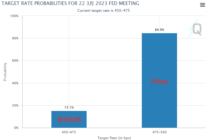 然而,过去两周以来,由于美国三家地区性银行接连倒闭,以及瑞士信贷集团被瑞银收购,市场和经济学家对美联储加息的预期有了大幅降温。芝商所的“美联储观察”工具显示,截至发稿,期货市场认为美联储本周有15.1%的概率暂停加息,另外84.9%的概率为继续加息25个基点。