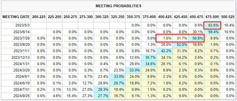 截至发稿,芝商所的“美联储观察”工具显示,市场预期该行在5月会议上不加息的概率高达83.6%,而加息25个基点的概率不到17%。该工具还显示,联邦基金利率区间有90%的概率回到4.5%-4.75%下方。
