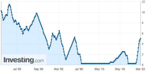 在新闻发布会上,鲍威尔表示该行仍致力于将通胀率压低至2%。而同一时间公布的“点阵图”也显示,决策者们整体认为美联储的利率将于年底达到5.1%,代表该行还将“净加息25个基点”。