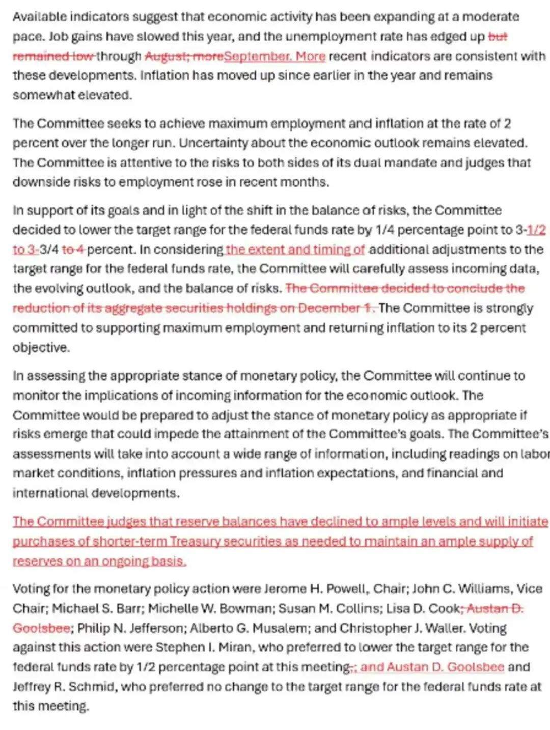 值得关注的是,美联储货币政策委员会成员在投票中再次出现了巨大分歧。其中,支持本次货币政策行动的有主席杰罗姆·H·鲍威尔、副主席约翰·C·威廉姆斯、迈克尔·S·巴尔、米歇尔·W·鲍曼、苏珊·M·柯林斯、丽莎·D·库克、菲利普·N·杰斐逊、阿尔贝托·G·穆萨莱姆以及克里斯托弗·J·沃勒;斯蒂芬·I·米兰则希望降息50个基点;而奥斯坦·D·古尔斯比和杰弗里·R·施密德则投票希望基准利率不做调整。